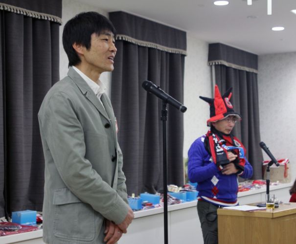 せっかく昇格したJ1から、たった1年でJ2に逆戻りした後にも関わらず、およそ50人が参加、大いに飲んで食べてチームが存続する限り応援を続けることを確認して気勢を上げた。