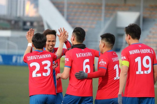 上写真/今季FCウランバートルはまだ波に乗り切れていない状況だが表情は明るい。こちら向きでハイタッチしているのが大津選手