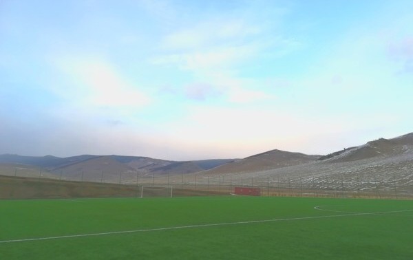 沢山の不安が私の脳裏をよぎる中、広い大地の中にぽつんと浮かんで見えるグラウンドが、バスの窓越しに見えてきました(少し安心)。キャンプ中に使用したこのグラウンドは、昨年に完成したばかりの、真新しい人工芝タイプのグラウンドです。モンゴル代表の国内強化合宿などにも使用できるように作られたそうです。