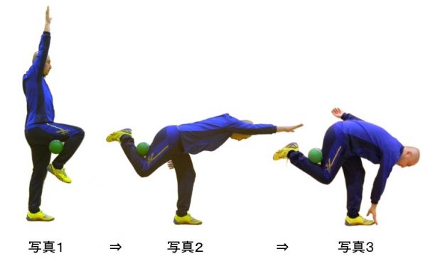 上写真1/片足立ちになり、上げた方の足のひざの裏でボールを挟み、地面と水平になるまで上げます。合わせて、挟んだ足側の手を上げます(写真では右足で挟み、右手を上げています)。立ち足のひざは少し曲げ、バランスを取りましょう