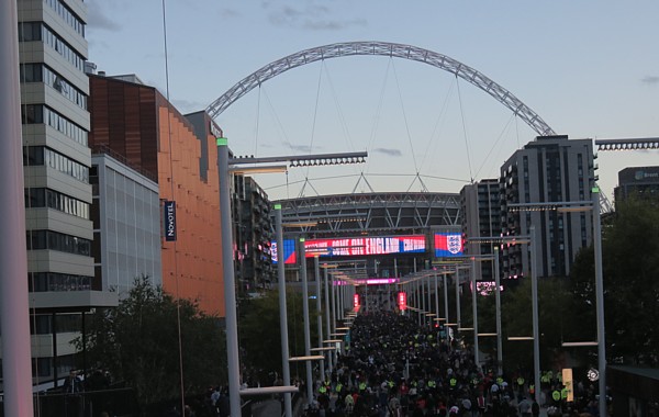 地下鉄Wembley Parkより一直線のコンコースがつながっておりスタジアムへ向かう。80年代・90年代の旧スタジアムの周囲はスポーツセンター、工場、そして倉庫が立ち込めるシャビーな町であった。それが現在では近代的なアパートが立ち並び、ホテル、レストランも多く、全くの様変わりである。元々Wembleyの町は特にインド人村として移民の町の様相を醸していたが、現在は新都市化しアフリカ系、インド系等との混合国際化しつつある街となっている。