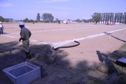 上:上段写真/グラウンドの土木工事の様子。暗渠(あんきょ)排水の整備を地面下にしっかりと行うことで、大雨でも水たまりの出来ない、水はけの良いグラウンドとなっている(2013年7月撮影)