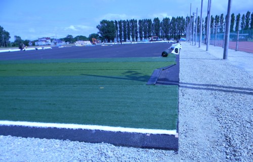 上:下段写真/人工芝工事の様子。ゼブラ模様の人工芝を採用することで、デザイン性だけではなく、公式試合時のオフサイドラインの見極めや、指導時のミニコートやグリッドの作りやすさなどの利点もある(2013年8月撮影)