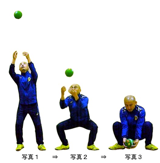 ⇒落ちてきたボールに合わせ一番低い位置(地面に着くギリギリのタイミング)でキャッチします。しゃがむ時には、全身の重さを感じながら瞬間的にひざ、みぞおち周辺の力を抜く感覚で、目の高さに来たボールに合わせて一気にしゃがみます(スッと力を抜くイメージです)。