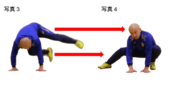 上写真1(左)/かかとを浮かさずにしゃがみ込んで両手を地面に付き、お猿さんのような体勢をとります。