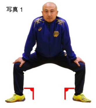上写真1/両足を開き、お相撲さんの四股(しこ)踏み前のような姿勢から、ひざが内側に倒れ込まないように、両方のひじを伸ばすようにひざの内側に入れます。なるべく足首の角度は90°(垂直)を意識しましょう。