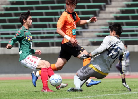 上:下段写真/後半21分、途中出場した岩教大MF縄田(右)のシュートを学園大DF三國(5番)がクリアする。三國はこの大会でベストDF賞を受けた