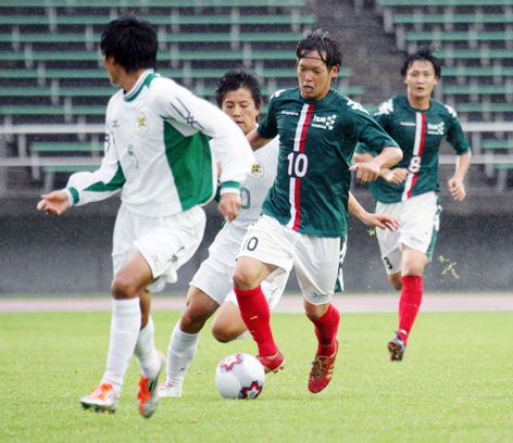 上:上段写真/前半21分ドリブルで突破する岩教大のFW大西(10番)、チームのエースストライカーとしての活躍を見せた