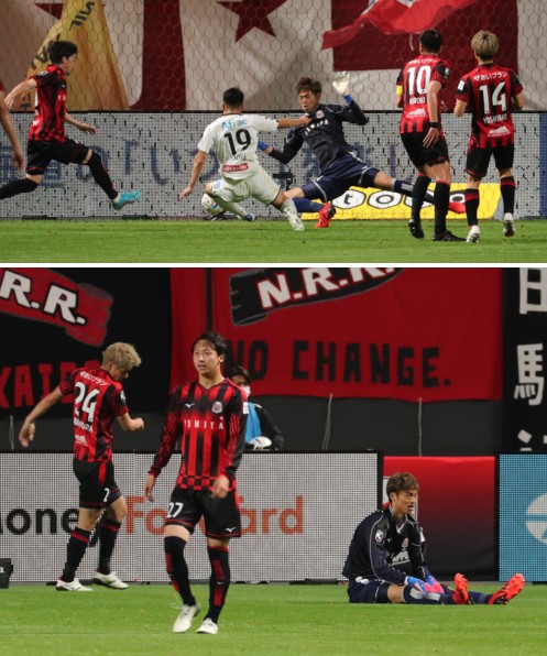 上:下段写真/前半26分、柏FW細谷に2点目を決められぼう然とする札幌GK中野、左へMF荒野(27番)、DF中村(24番)