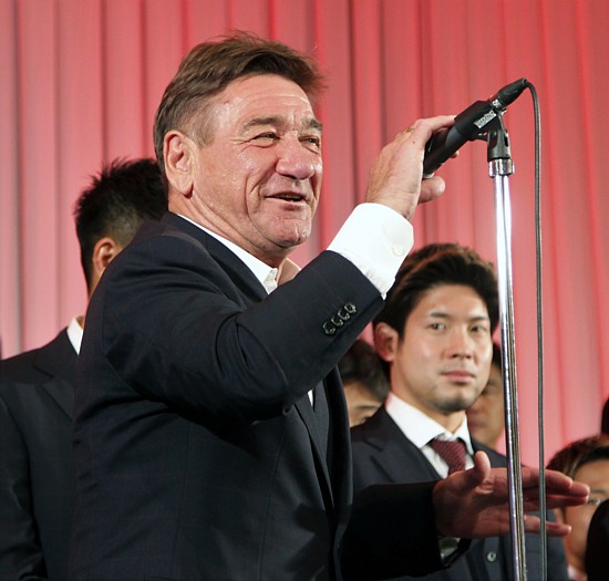 上写真/宮澤のあいさつが終わるや否や、一言言わせてくれとペトロビッチ監督がマイクを手に宮澤を絶賛した