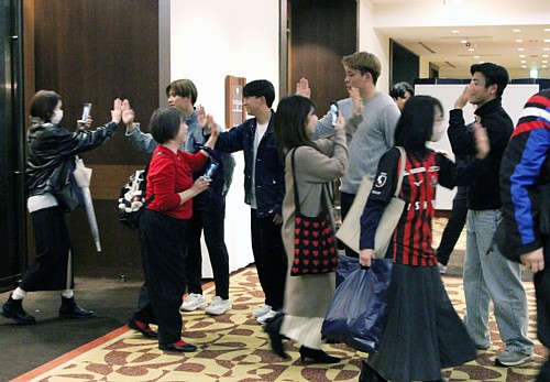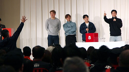 上写真/サポーターとじゃんけんする出間選手(右端)、左へ原選手、近藤選手、家泉選手