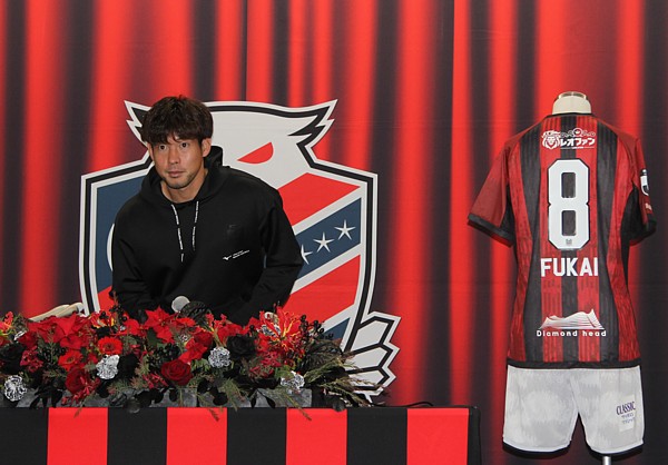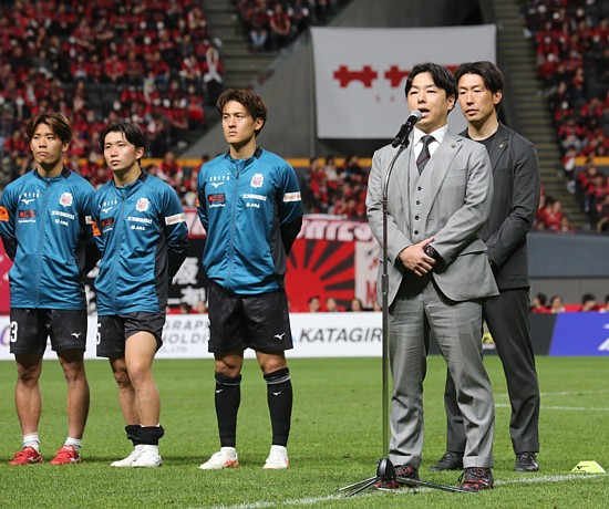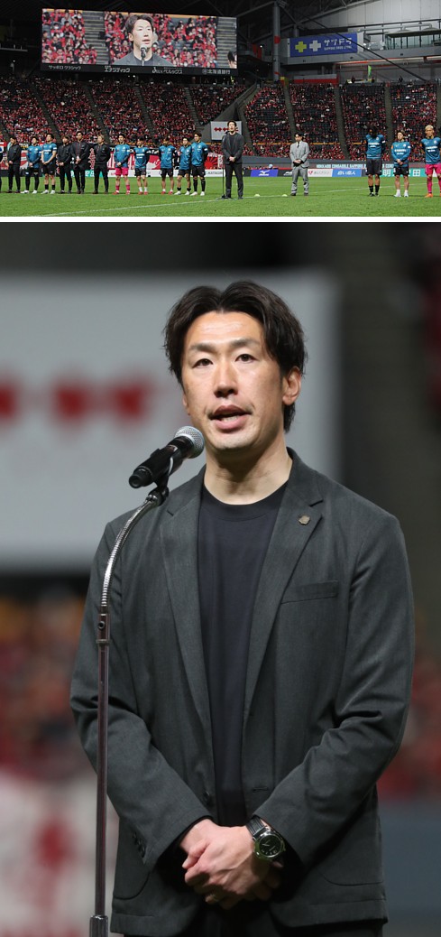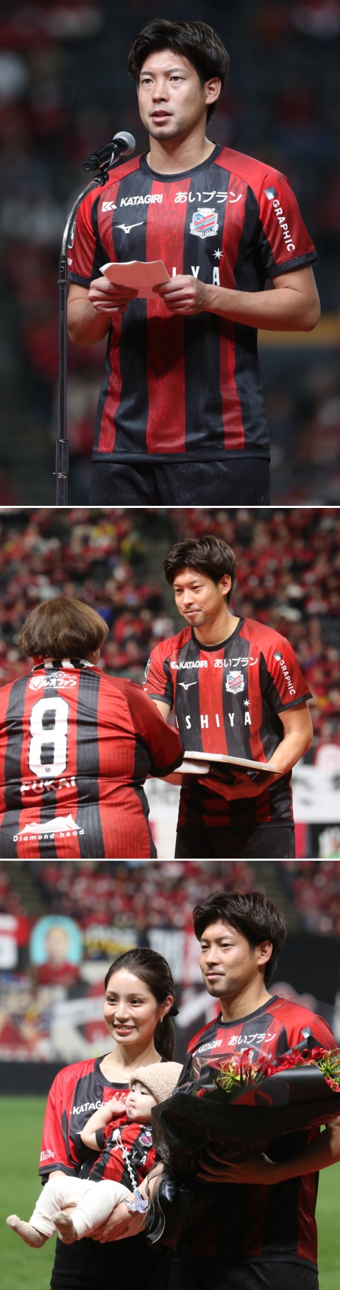 上:上段写真/引退セレモニーであいさつする深井一希選手、「将来、監督として戻ってくるのが夢」と語った