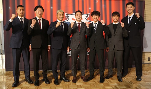 上写真/新入団選手会見を終えそろってガッツポーズ、左から田川知樹、川原颯斗、内田瑞己、堀米悠斗、佐藤陽成、堀米勇樹、唯野鶴真の各選手