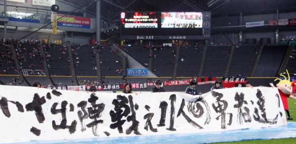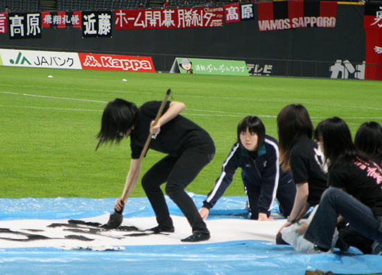上写真/4月23日、札幌ドームで行われたJ2第8節コンサドーレ札幌対湘南ベルマーレ戦、試合前に札幌南高校書道部の生徒たちが、再開するコンサドーレ札幌の選手たちと、東日本大震災の被災地の人々を激励する言葉を、ピッチの中の敷物上で約10メートルの紙に大書した
