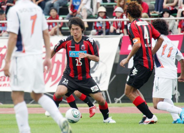 上写真/前の試合で負傷しベンチスタートとなったMF宮澤のボランチの位置に入った河合(4番)に代わってセンターバックで先発の札幌新人DF櫛引(25番)が前半38分ボールをさばく。フル出場して無難に大役をこなした