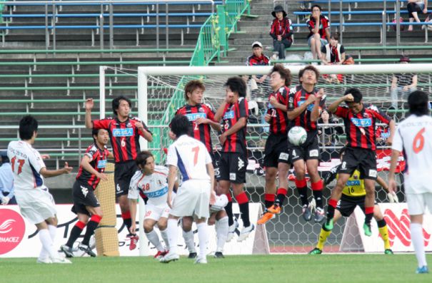 上写真/後半8分札幌ゴール正面での愛媛FCのMF大山(左端)のFKは壁となった札幌MF河合(4番)の腹を直撃する。札幌の壁、左からMF高木(純)、DF岩沼(6番)、日高(2番)、櫛引(25番)、FW近藤(32番)、MF砂川、後方にGK李
