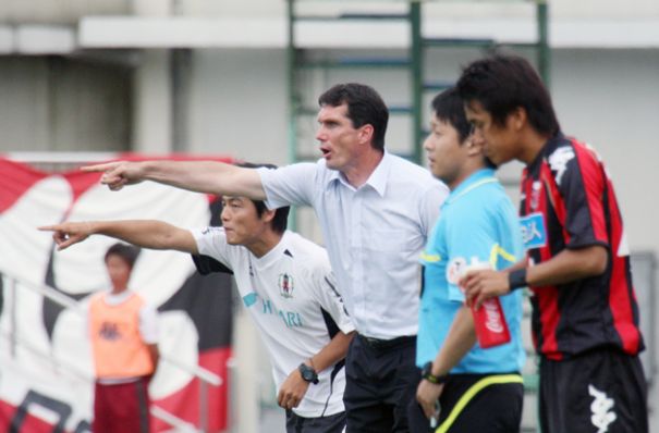 上写真/後半34分途中出場で待機する札幌FW横野(右)の脇で懸命に指示を出す愛媛のバルバリッチ監督。まさかこの後、この横野に2点も入れられるとは、夢にも思わなかっただろう