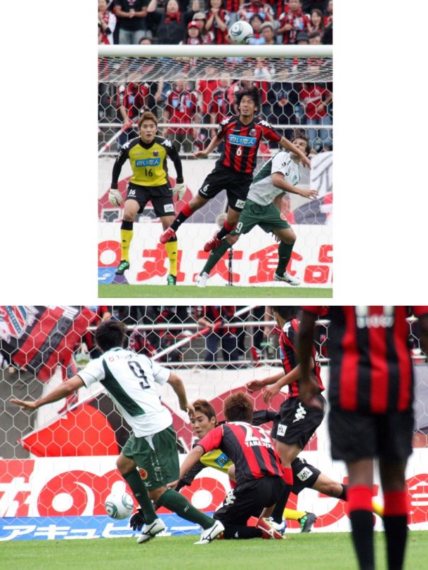上:上段写真/前半19分栃木の左CKからの攻撃を札幌DF岩沼(6番)、がヘッドでクリア。岩沼はこの試合前半5分にFWジオゴの先制点をFKでアシストするなどの活躍を見せた。左はGK李(16番)、右は栃木FWロボ(9番)