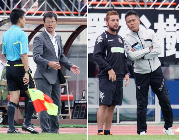 上:左写真/前半35分栃木FW崔根植がイエローカードを受けた直後、何事か副審(左)に抗議のジェスチャーの栃木SC松田浩監督