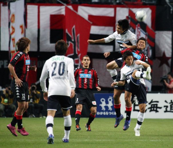 上写真/後半35分コンサドーレ札幌の左CKからの攻撃、新加入のDFノース(右端)が高い打点のヘディングでゴールを狙うもならず。中央はFWキリノ(19番)、その左、ジュビロ磐田のFW前田、左端DF駒野