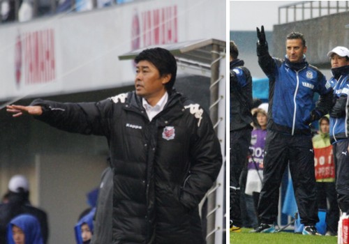 上:右側写真/後半追加タイム1分、最後まで諦めず懸命に指示を出す磐田のシャムスカ監督