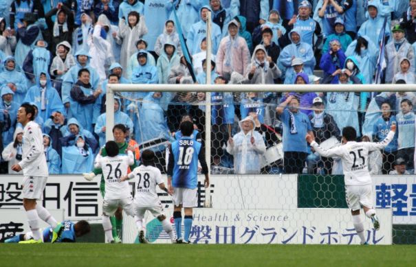 上写真/遠路駆けつけた札幌のサポーターたちが、磐田を1−0で破った札幌の選手たちを迎えて大歓声を上げる