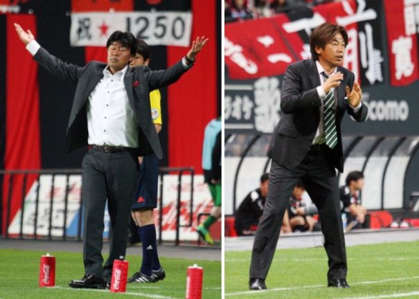 上:左側写真/後半7分、札幌右サイドのDF小山内からのクロスをMF宮澤が受けた時、東京MF前田を倒したとのファールの判定に憤然とする札幌の財前恵一監督