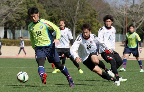 上写真/V・ファーレン長崎との練習試合で、稲本とともに川崎フロンターレから移籍してきたDF福森が前半43分、左サイドからFW都倉の同点ゴールを呼ぶ絶妙のクロスを上げる。福森は20日のFC町田ゼルビアとの試合でも1本目の左DFで先発しており、首脳陣の期待がうかがわれる。2月22日、島原市営陸上競技場