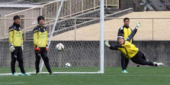 上写真/昨季金山(左端)と二人でゴールを守ったイ ホスンが湘南ベルマーレへ移籍し、新たに加わった韓国人GKク ソンユン(右手前飛んでいる)とベテラン杉山(右後方)、若い阿波加(左から2人目)の4人が正GKを目指して厳しく競う。2月21日、熊本県大津町運動公園