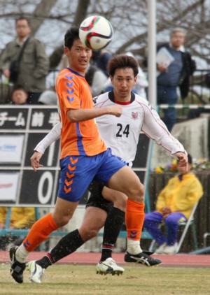 上:右側写真/長崎との練習試合でセンターバックとして途中出場、クロスを上げる元日本代表で札幌MF稲本。2月22日、島原市営陸上競技場