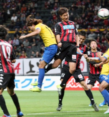 上写真/写真7、11月23日、最終節の栃木戦。前半42分、コンサドーレ札幌はDF福森の右CKから、MF宮澤(10番)が栃木DF山形(17番)をかわしながらヘディングシュートを決め2点目をあげた