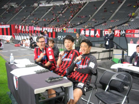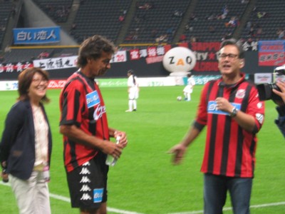コンサドーレは98年4月16日が創立(JFL加盟)で、今年は20周年の記念行事が多い。その歴史を彩ったプレーヤーを集めてのマッチには96年入団のDFペレイラ、初代キャプテンの後藤義一、FW吉原宏太。97年のバルデスは、驚異のストライカー。この日戦うJ2セレッソ大阪から初対決の98年7月29日に2得点を奪ったつわもの。スタジアムには、選手を紹介するDJ・Guchyも来場、なつかしのシェイクハンド。試合を観戦しながらの選手紹介。OBたちの相手が、一昨年編成されたリラのかわいい女子中学生。赤黒の往時を思い出させる背番号を付けた「おじさんたち」は、恐る恐るだが、必死の形相。かわいらしいプレーに「おーっ。イケイケ」の歓声、率いる宗像訓子監督も当時からコンサド運営陣で知らぬ仲ではない。