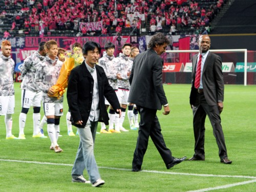 上写真/4月23日のC大阪戦、北海道コンサドーレ札幌の20周年を記念して、OBのバルデス氏、ぺレイラ氏、後藤義一氏(右から)によって、試合開始前花束が贈呈された。左端、花束を受けたC大阪のキャプテンFW柿谷。撮影・石井一弘