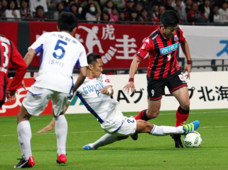 徳島ヴォルティス戦前半7分、ペナルティーエリア内に攻め込んだ北海道コンサドーレ札幌のFW都倉(9番)は、ゴール前を固める徳島DF陣をかわすため、左へ、左へとシュートチャンスを狙ってボールを運ぶ。そのときDF陣の中から足が伸びる。