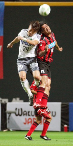 上写真/前半24分、ロングボールを奪い合う札幌DF増川(18番)と松本FW高崎(29番)。高崎は今季松本に移籍、好調松本の得点源だが、札幌は増川を中心に高崎を押え込み、得点を与えなかった