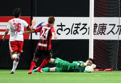 熊本は前半26分、ロングボールをFW巻が落としてDF藏川へ。藏川がペナルティーエリア右から中央へクロス。これを札幌MFマセードのクリアーミスがありボールは熊本MF岡本へ転がる。一瞬フリーとなった岡本は、左足でグラウンダーシュートを放つもわずかにゴールの右。内村は前半27分にもペナルティーエリア内でFW都倉のヒールぎみのうまいパスから抜け出し、ループシュートを放つも仕留めきれなかった。