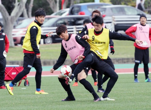 上写真/北海道コンサドーレ札幌は、J1の厳しい戦いに向けて1月16日から2月6日まで、沖縄県の金武町陸上競技場で強化キャンプを行った。写真は、1月30日、別メニュー組だがボールを奪い合う稲本(左)と深井、昨年の大けがからここまで回復してきている
