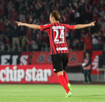上写真/前半38分、先制弾を決めたDF福森(24番)に飛びついて祝福するMF荒野、左は笑顔で走り寄る早坂(26番)