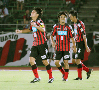 上写真/ロングシュートを決め喜ぶMF上里(20番、左端)にパスを出したMF砂川(8番)も、嬉しいというより、びっくりしたような表情を見せた、右端はDF吉弘