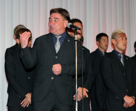 上写真/同じく「感謝の集い」であいさつをするペトロビッチ監督。優秀監督賞受賞の話に「後ろに並ぶスタッフ、選手たちのおかげです」と感謝した