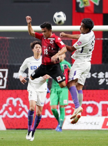 上写真/最後は12月1日、札幌ドーム、サンフレッチェ広島との最終戦からの1枚。後半17分、共にタイ代表の札幌MFチャナティップ(18番)と広島FWティーラシンが高々とジャンプしてヘディングを競い合う。チャナティップの跳躍力にビックリ