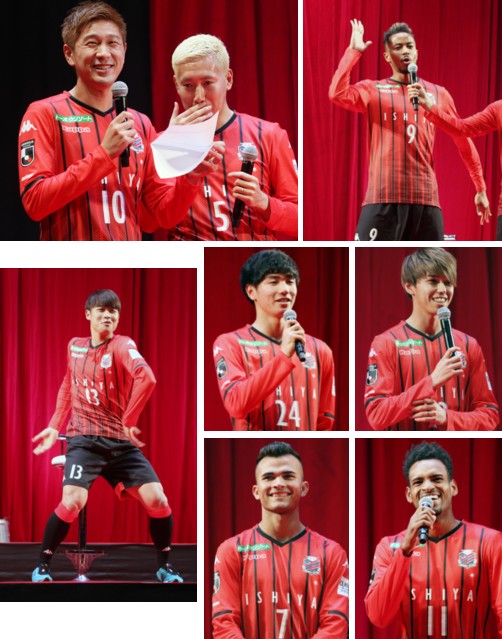 上写真/左上、進行役を務めた宮澤(10番)と福森(5番)が新入団選手を紹介。一発芸を披露したFW鈴木(右上・9番)と岩崎(左下・13番)。その他、中央24番の中村、右中央の中野、中央下7番のルーカス、右下11番のアンデルソン