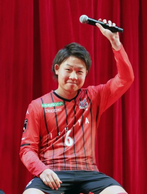 上写真/長崎への期限付き移籍から復帰したMF中原(6番)がファンの「お帰り!」の声に「ただいま」と応じた