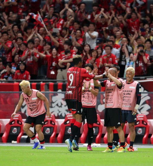 上写真/後半23分、同点ゴールを決めた札幌MF鈴木(9番)はベンチに走り、この試合を最後に移籍するMF小野とハイタッチ、サポーターもバンザイで祝福