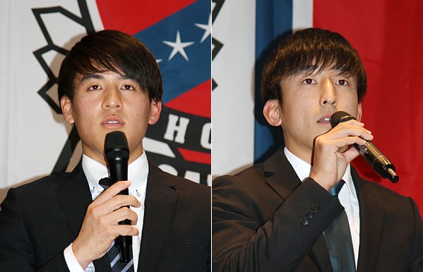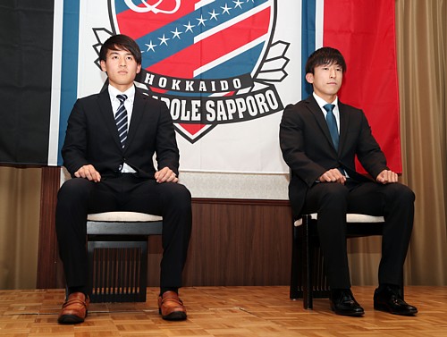1月10日、札幌グランドホテルで開かれた新加入選手記者会見で紹介される高嶺朋樹選手(左)と金子拓郎選手(右)。撮影・石井一弘