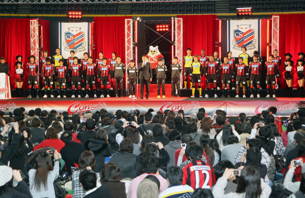 コンサドーレ札幌キックオフ2011でユニフォーム姿で勢揃いした選手、スタッフたち、中央で挨拶するのが石崎信弘監督。1月16日、札幌ドーム、撮影・石井一弘