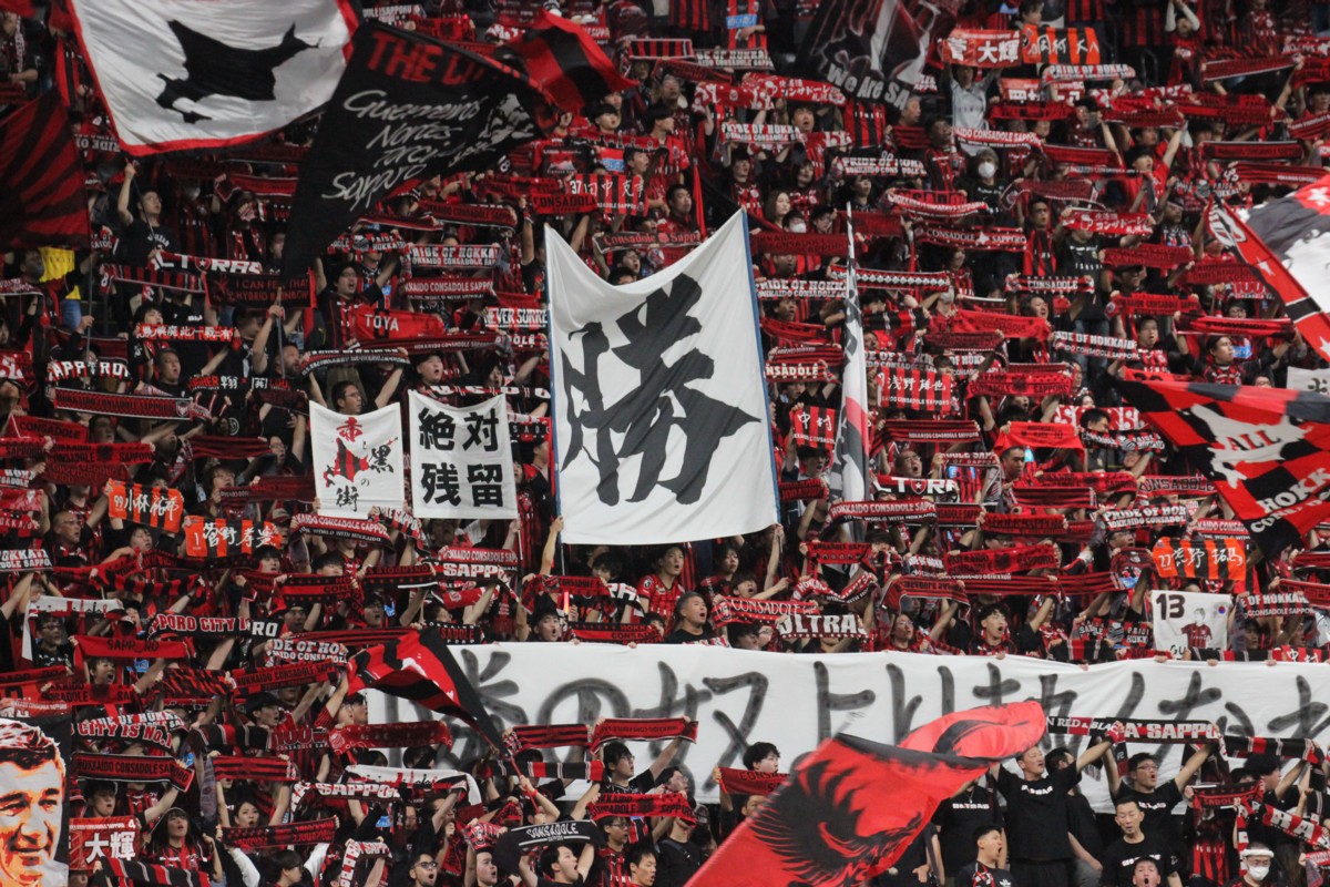 J1第35節北海道コンサドーレ札幌対セレッソ大阪戦で「絶対残留」、「勝」などの旗をかざす札幌のサポーターたち。(写真は11月3日、大和ハウス プレミストドーム、撮影・石井一弘)