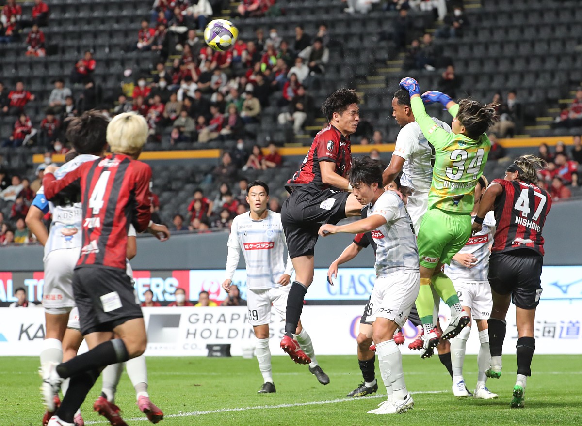後半23分、札幌左CKの攻撃で飛び込んだDF宮(中央)より一瞬早くパンチングでクリアーする水戸GK西川(34番)、その左DFトラビス、左手前途中出場していた札幌DF中村(4番)、右端西野(47番)。写真は10月26日、大和ハウス プレミストドーム、撮影・石井一弘
