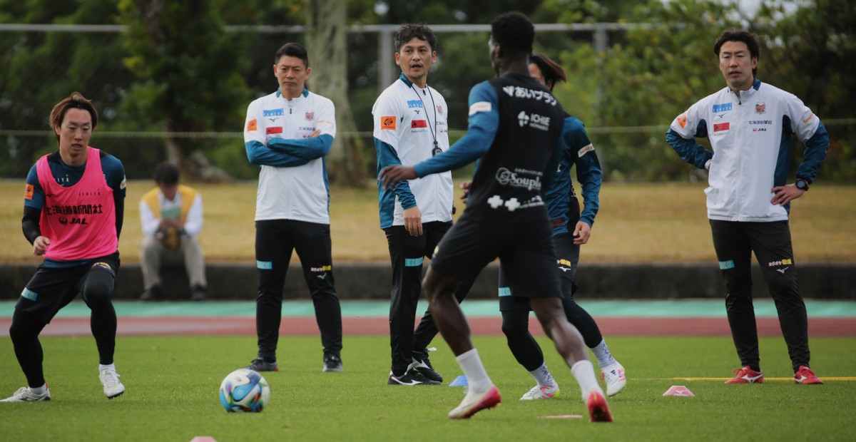 FW白井(左端)らの動きを見守る川井健太監督(中央)、その左河合GM、右端前監督の柴田コーチ。写真は1月19日、沖縄県金武町陸上競技場、撮影・石井一弘